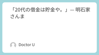 「20代の借金は貯金や。」— 明石家さんま 20代の借金は貯金や。 📝 名言をコピー 🧭 IF–THEN例をコピー ⏱ 1分タイマー開始 ⏳ 残り 60 秒 📲 共有(端末) 🔗 URLをコピー 𝕏で共有 効能(効くポイント) 失敗・負債の...