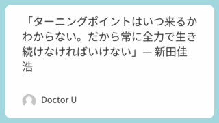 「ターニングポイントはいつ来るかわからない。だから常に全力で生き続けなければいけない」— 新田佳浩 ターニングポイントはいつ来るかわからない。だから常に全力で生き続けなければいけない。 📝 名言をコピー 🧭 IF–THEN例をコピー ⏱ 1...